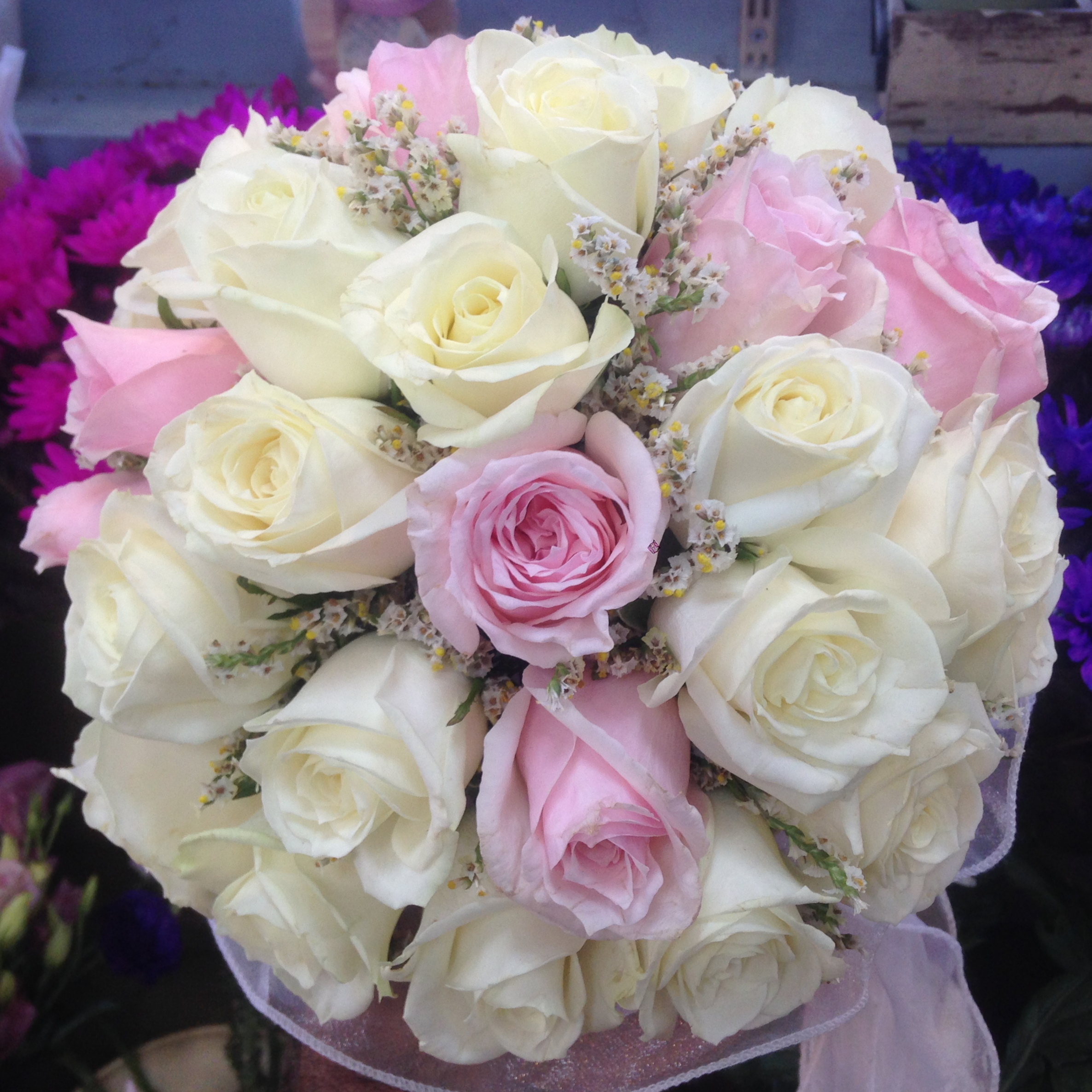 זר כלה מעוצב בשילוב ורדים לבנים וורודים נגיעות לימוניום בהירות.