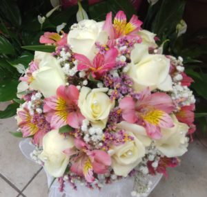 זר כלה מעוצב בשילוב ורדים לבנים פרחי אסטרומריה ורודים גיפסנית ולימוניום בתוספת פנינים וטול.