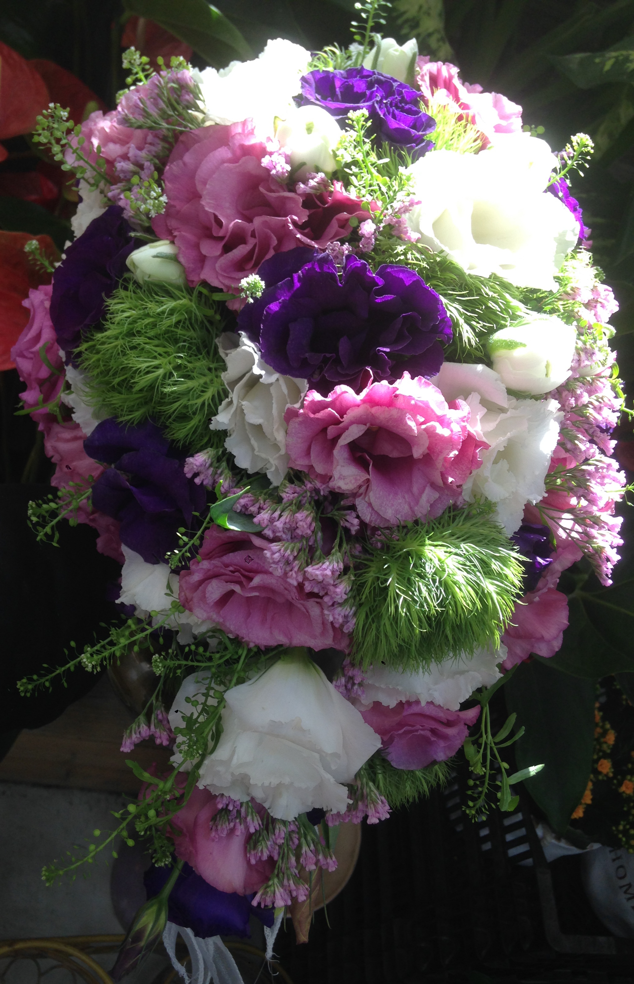 זר כלה נשפך מעוצב המשולב בפרחי הליזיאנטוס בגווני הפסטל נגיעות לימונים עופרים ותפוחי סנים ססגונים.